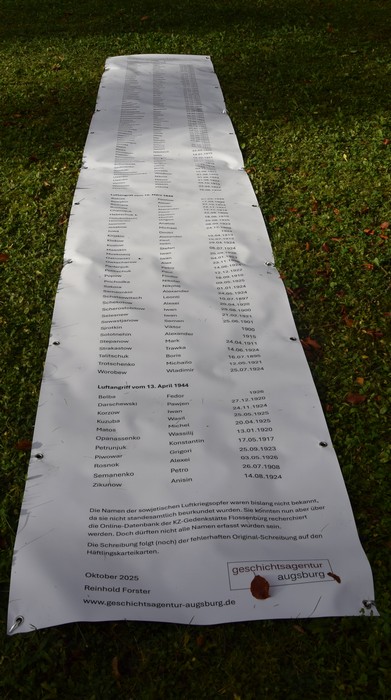 Nach der Begrüßung durch Harald Munding sprach Ellen Puff , die aus ihrer Arbeit zur Geschichte der Nutzung dieses Erinnerungsortes berichtete. Anschließend erinnerte Reinhold Forster von der geschichtsagentur augsburg mit einer temporären Installation (Bild links) an über 120 bislang namentlich unbekannte sowjetische KZ-Häftlinge, die bei alliierten Luftangriffen ums Leben gekommen waren. Ihre Namen konnten erst kürzlich recherchiert werden.