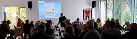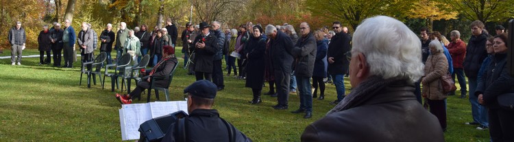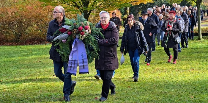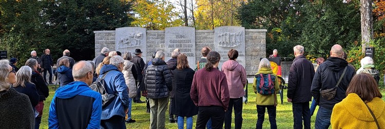 Etwas mehr als 100 Menschen kamen am1. November zur Gedenkveranstaltung auf dem Westfriedhof zusammen, um der Opfer des Nationalsozialismus zu gedenken. Mehrere Organisationen legten Gebinde vor dem neu gereinigten Gedenkstein nieder, auf den Gedenkplatten des Ehrenhains wurden rote Nelken als Zeichen des Erinnerns platziert.