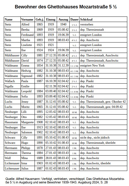 Quelle: Alfred Hausmann: Verfolgt, vertrieben, verschleppt. Das Ghettohaus Mozartstraße 5 ½ in Augsburg und seine Bewohner 1939-1943. Augsburg 2024 |