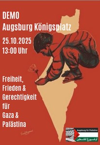 Die Gruppe Augsburg für Palästina veranstaltet eine Kundgebung mit Demo durch die Augsburger Innenstadt, bei der die Einhaltung des Waffenstillstand, ein Stopp deutscher Waffenexporte und endlich eine ausreichende Versorgung der Bevölkerung gefordert werden.